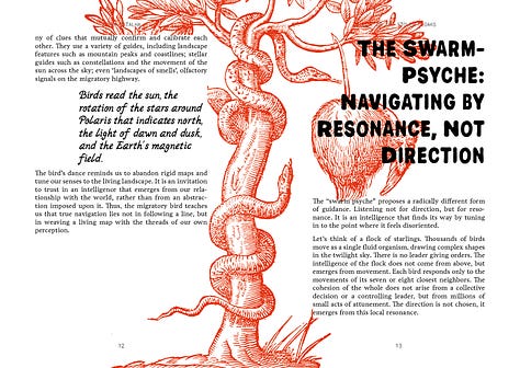 This publication explores the living concept of “Swarm Psyche” as a collective, relational, and migratory understanding of the psyche, contrasting it with the modern individualistic self. We approach the psyche as a porous, emergent, and interconnected field, similar to flocks of birds (or schools of fish and swarms of bees), where direction arises from relationships rather than from a central command, moving to the rhythm of relational listening. Here, we cultivate the psyche as a collective, fluid, and constantly moving field.