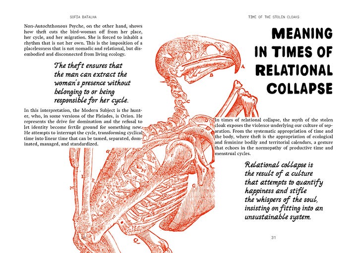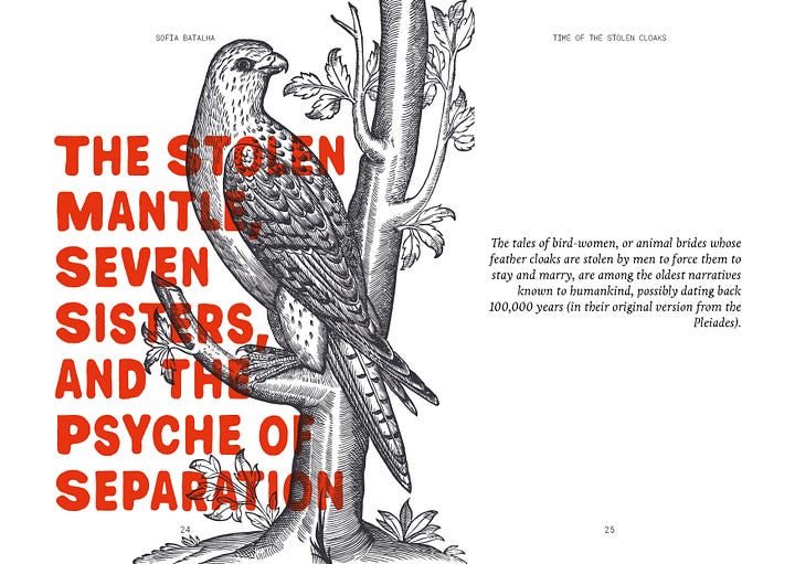 I’ve been carrying all this around for months, and the other day, I was going to write an article about how birds can fertilize our psyche, from an eco-mythological perspective... but it ended up being too long. I gave it a graphic form and am releasing it as a PDF (although this is part of a larger ongoing inquiry). The Time of Stolen Cloaks talks about the psyche as a collective field, fluid and in constant motion.
